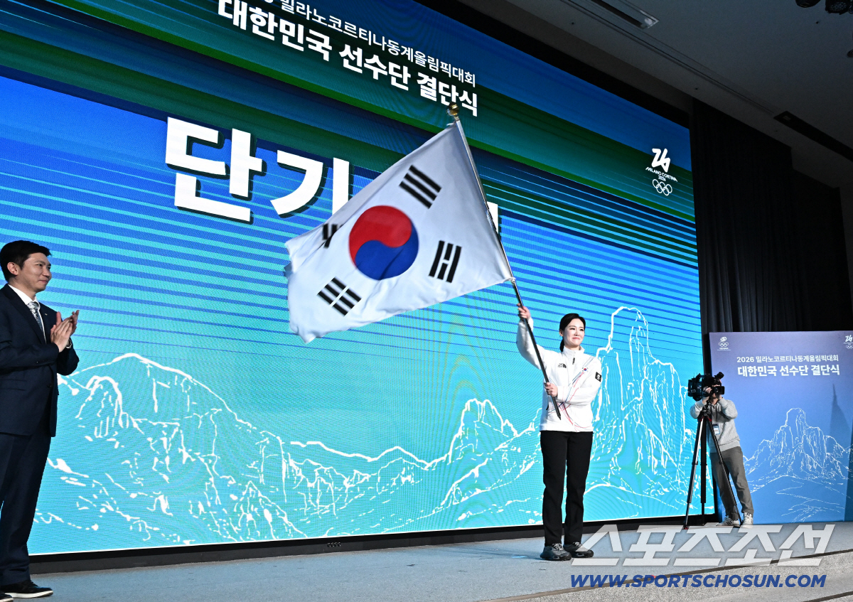22일 잠실 올림픽파크텔에서 '2026밀라노코르티나 동계올림픽' 출전 대한민국 선수단 결단식이 열렸다. 이수경 선수단장에게 단기를 전달한 대한체육회 유승민 회장. 잠실=송정헌 기자songs@sportschosun.com
