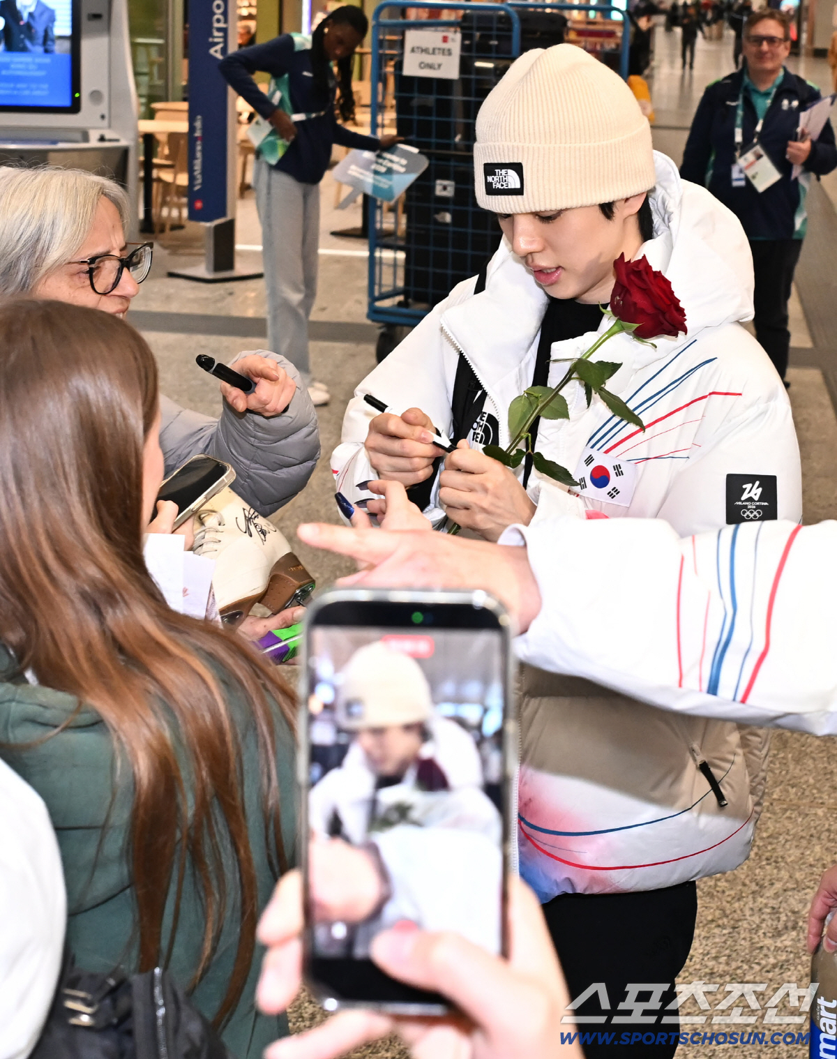 5일 오전 피겨대표팀 선수단이 동계올림픽이 열리는 밀라노 말펜사국제공항에 도착했다. 이탈리아 팬에게 사인을 해주고 있는 차준환. 밀라노(이탈리아)=송정헌 기자songs@sportschosun.com/2026.02.05/
