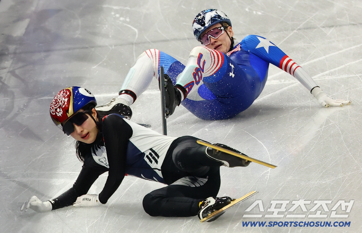 10일 이탈리아 밀라노 아이스스케이팅 아레나에서 쇼트트랙 혼성 계주 경기가 열렸다. 준결승 미국팀과 충돌하며 넘어진 김길리. 밀라노(이탈리아)=송정헌 기자songs@sportschosun.com/2026.02.10/