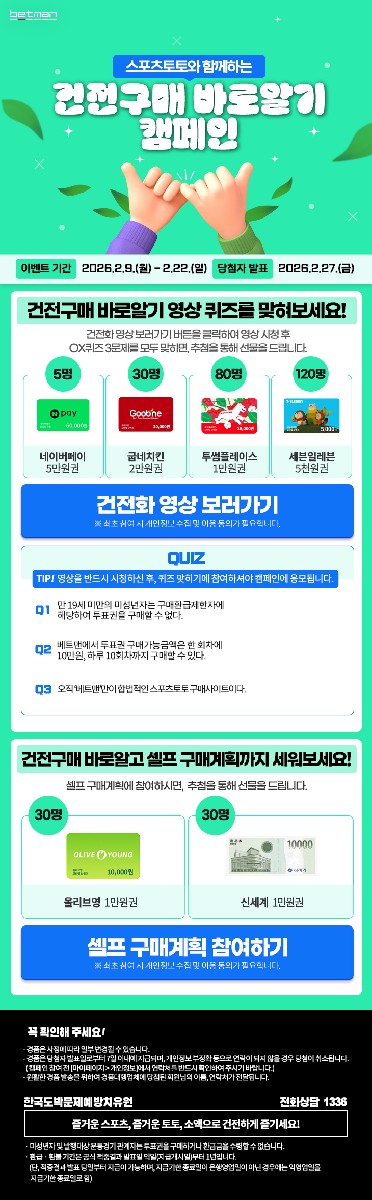 서울올림픽기념국민체육진흥공단(이사장 하형주)이 발행하는 체육진흥투표권 스포츠토토의 수탁사업자 한국스포츠레저가 공식 인터넷 발매 사이트 베트맨을 통해 이용자의 건전한 투표권 구매 문화 정착을 위한 '건전구매 바로알기 캠페인' 이벤트를 실시한다고 밝혔다.