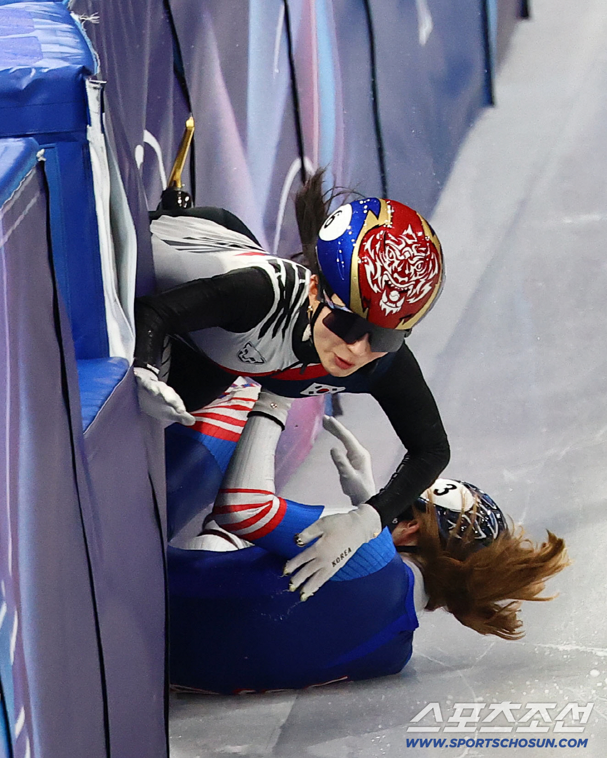 10일 이탈리아 밀라노 아이스스케이팅 아레나에서 쇼트트랙 혼성 계주 경기가 열렸다. 준결승 충돌 후 최민정과 터치하는 김길리. 밀라노(이탈리아)=송정헌 기자songs@sportschosun.com/2026.02.10/