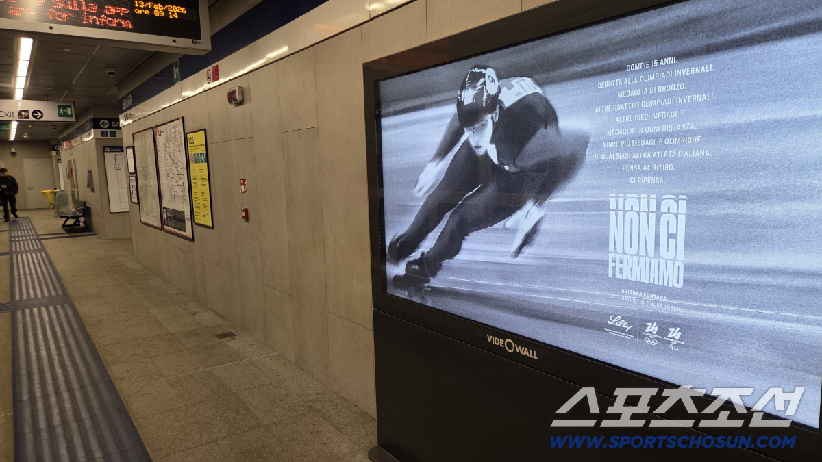 이탈리아 지하철에 나오는 밀라노동계올림픽 홍보 사진 속 폰타나. 폰타나는 "언제나 반드시 웃으세요"라고 전하고 있다. 밀라노(이탈리아)=송정헌 기자