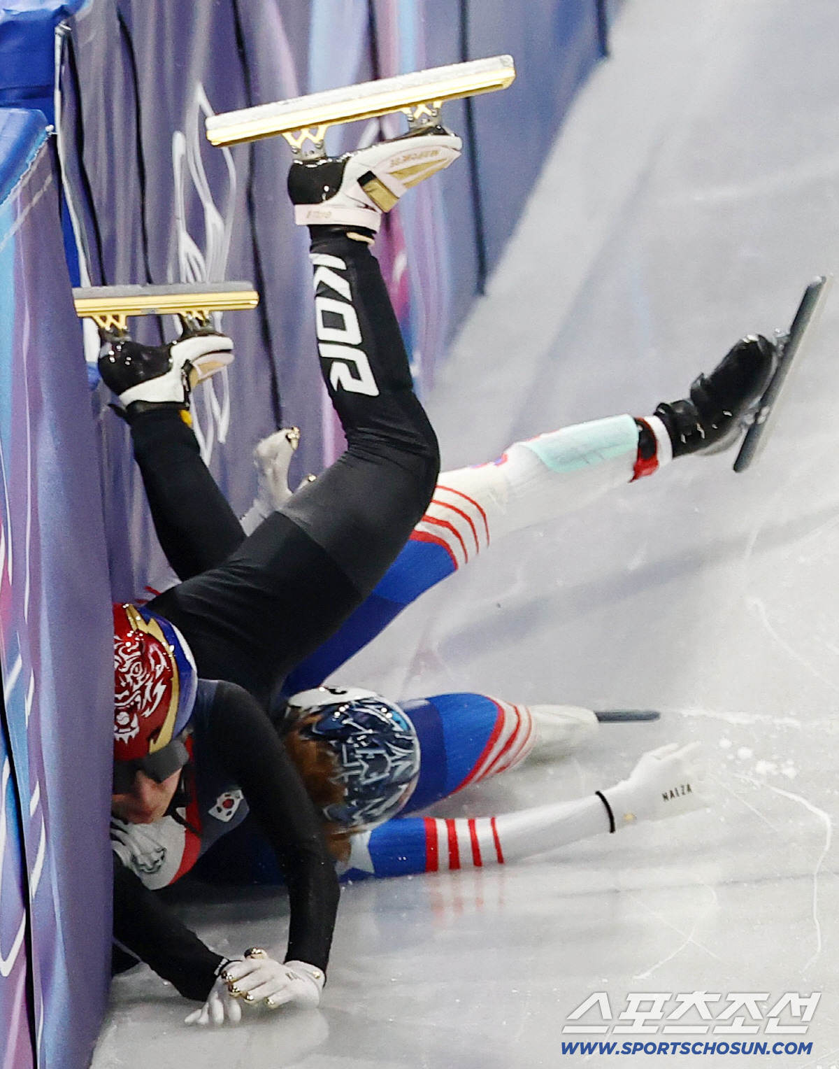 10일 이탈리아 밀라노 아이스스케이팅 아레나에서 쇼트트랙 혼성 계주 경기가 열렸다. 준결승 미국팀과 충돌하며 넘어진 김길리. 밀라노(이탈리아)=송정헌 기자songs@sportschosun.com/2026.02.10/