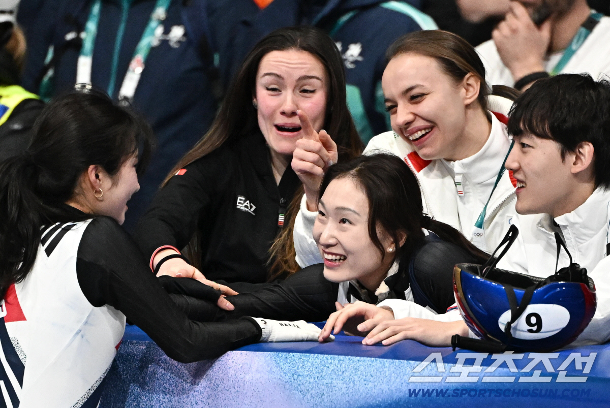 16일 이탈리아 밀라노 스피드스케이팅 아레나에서 열린 밀라노동계올림픽 쇼트트랙 여자 1000m 결승전. 김길리가 동메달을 차지했다. 눈물 터진 김길리 놀리는 외국인 코치들과 최민정. 밀라노(이탈리아)=송정헌 기자songs@sportschosun.com