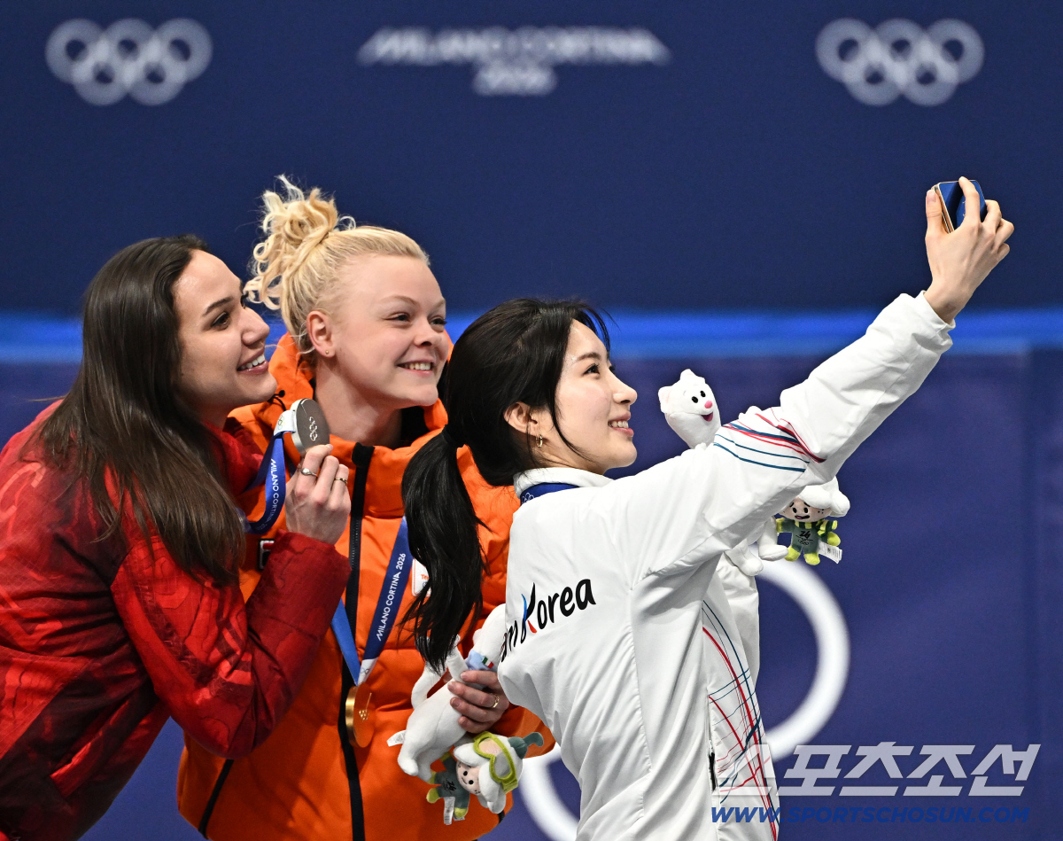 16일 이탈리아 밀라노 스피드스케이팅 아레나에서 열린 밀라노동계올림픽 쇼트트랙 여자 1000m 결승전. 김길리가 동메달을 차지했다. 수상자들과 함께 셀카를 찍고 있는 김길리. 밀라노(이탈리아)=송정헌 기자songs@sportschosun.com