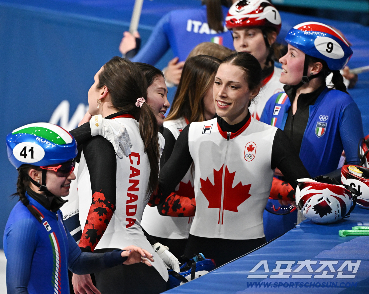 19일(한국시간) 이탈리아 밀라노 스피드스케이팅 아레나에서 열린 밀라노동계올림픽 쇼트트랙 여자 3000m 계주 결승전. 여자 계주 대표팀이 금메달을 차지했다. 캐나다 선수들과 포옹을 나누는 심석희. 밀라노(이탈리아)=송정헌 기자songs@sportschosun.com/2026.02.19/