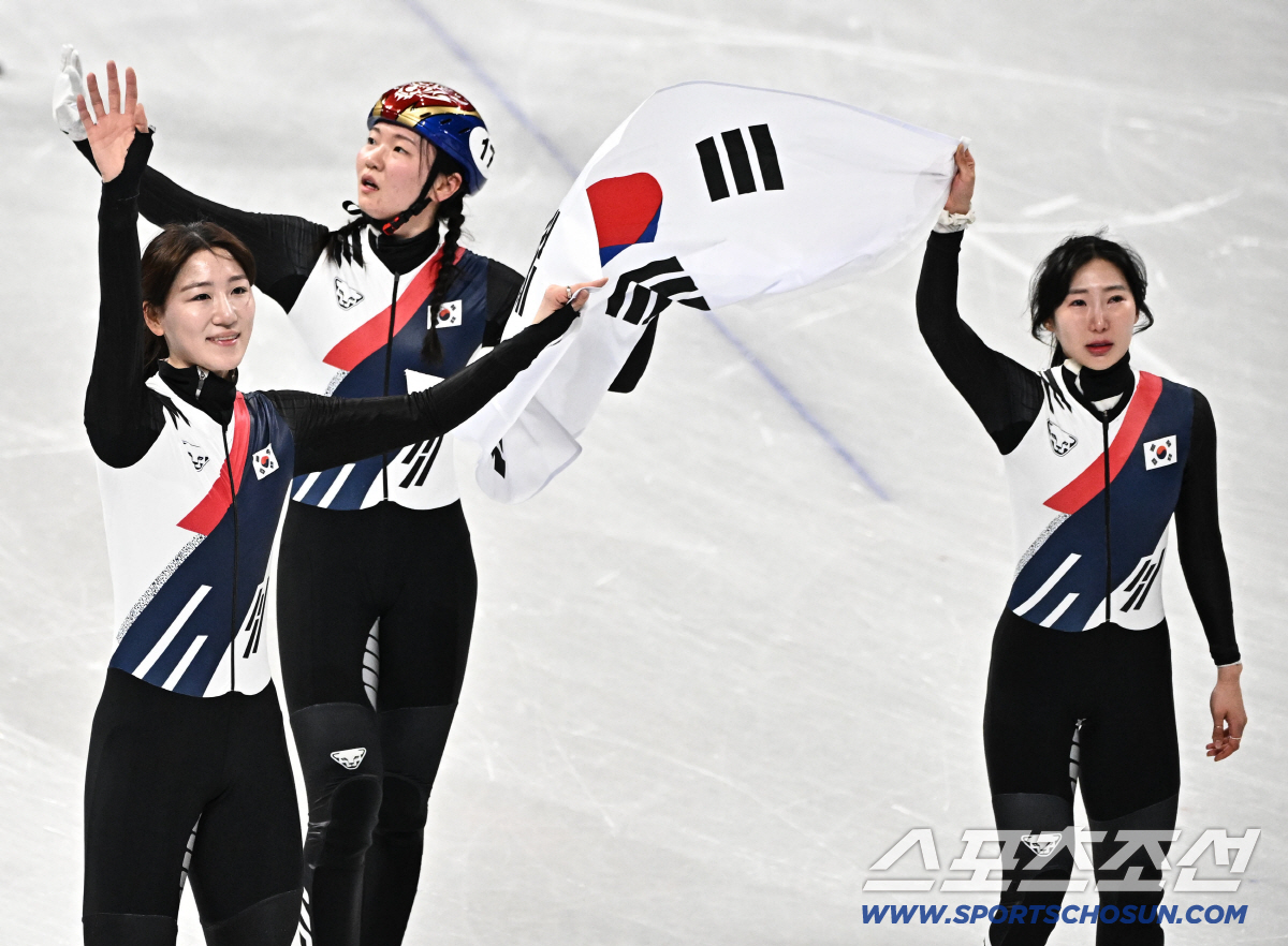 19일(한국시간) 이탈리아 밀라노 스피드스케이팅 아레나에서 열린 밀라노동계올림픽 쇼트트랙 여자 3000m 계주 결승전. 여자 계주 대표팀이 금메달을 차지했다. 기쁨 나누는 노도희, 심석희, 이소연. 밀라노(이탈리아)=송정헌 기자songs@sportschosun.com/2026.02.19/