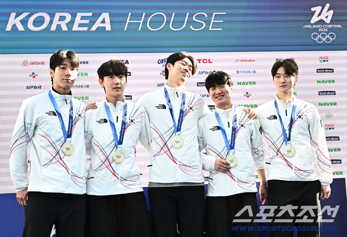 21일 이탈리아 밀라노 코리아하우스에서 쇼트트랙 메달리스트 기자회견이 열렸다. 메달 들고 포즈 취하는 황대헌, 임종언, 이준서, 이정민, 신동민(왼쪽부터). 밀라노(이탈리아)=송정헌 기자songs@sportschosun.com/2026.02.21/