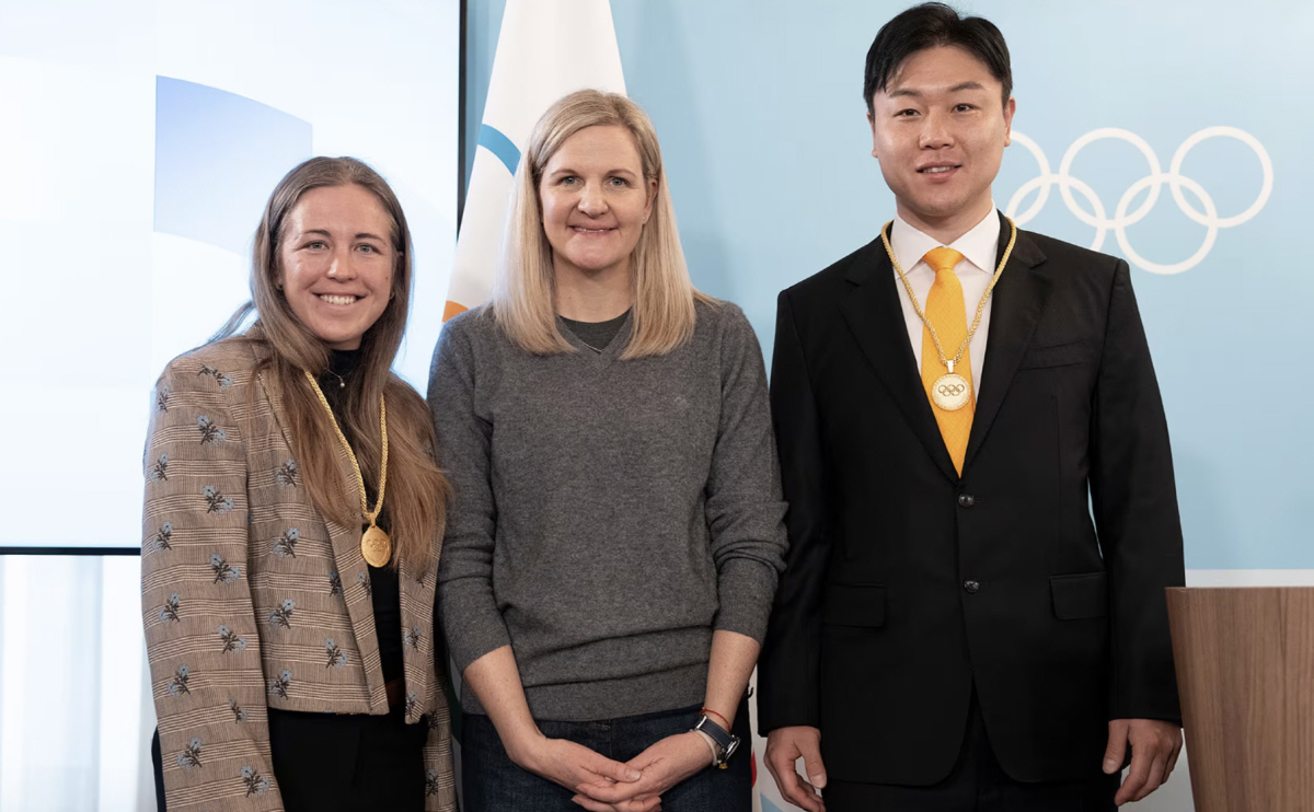 왼쪽부터 신임 IOC선수위원 요하나 탈레헤름과 커스티 코번트리 IOC위원장, 원윤종 신임 IOC선수위원. 사진 출처=IOC