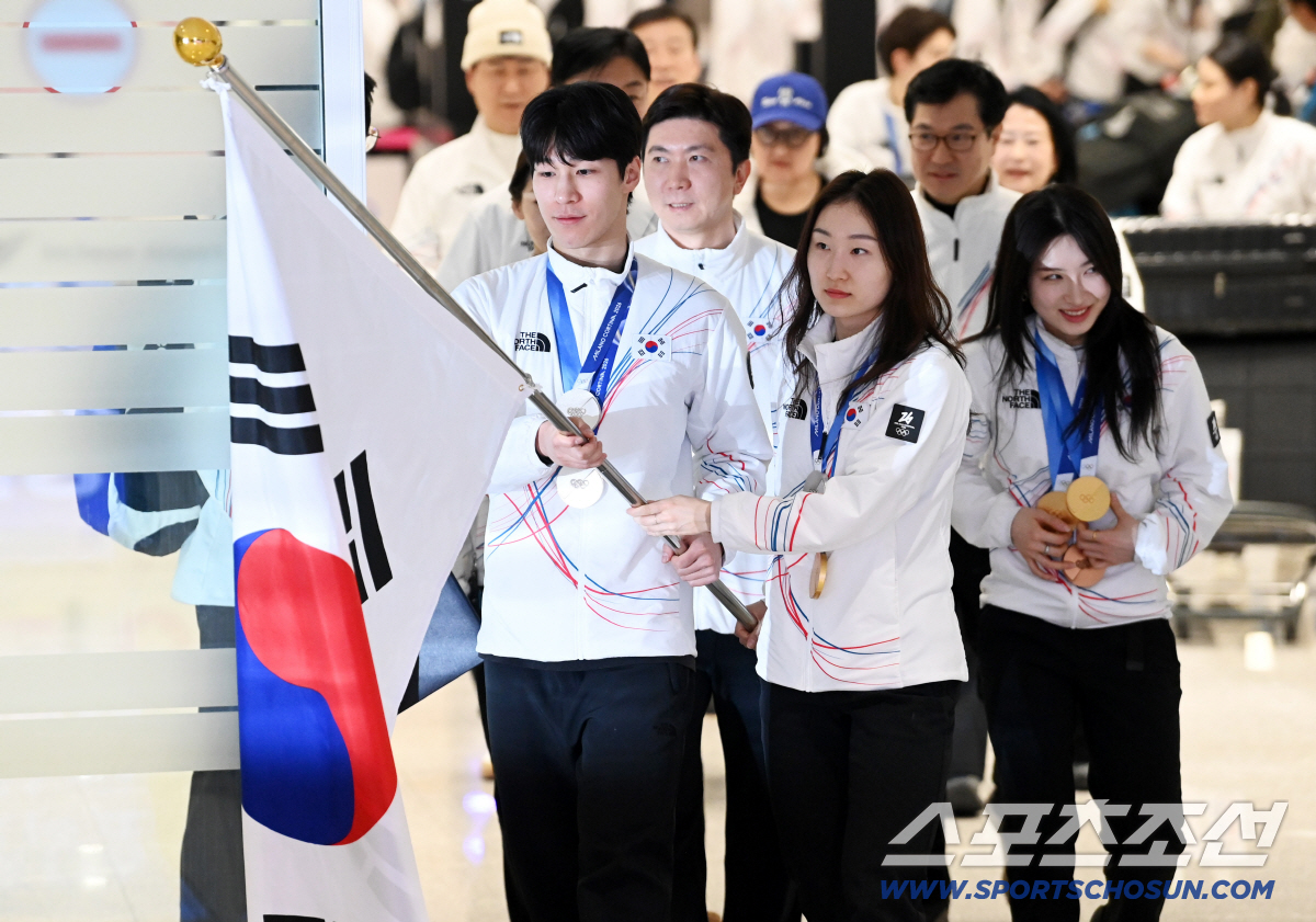 밀라노·코르티나담페초 동계 올림픽을 마친 대한민국 선수단이 24일 인천공항을 통해 귀국했다. 태극기와 함께 입국장으로 들어서는 황대헌, 최민정, 김길리의 모습. 인천공항=허상욱 기자wook@sportschosun.com