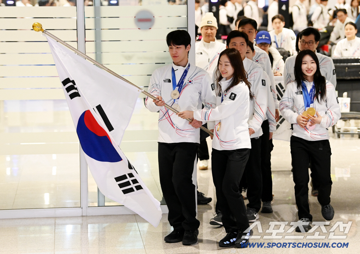 밀라노·코르티나담페초 동계 올림픽을 마친 대한민국 선수단이 24일 인천공항을 통해 귀국했다. 태극기와 함께 입국장으로 들어서는 황대헌, 최민정, 김길리의 모습. 인천공항=허상욱 기자wook@sportschosun.com