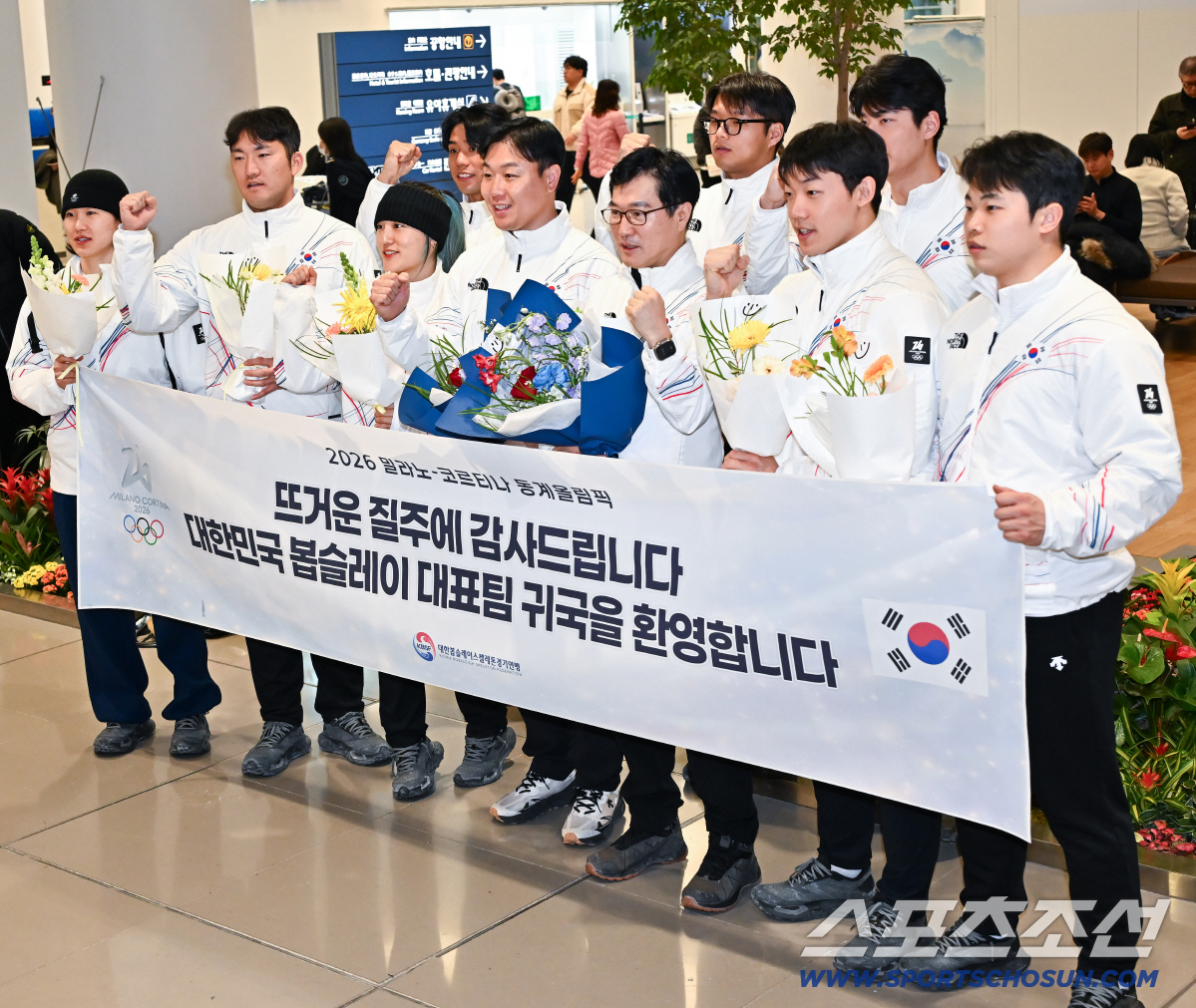 2026 밀라노·코르티나담페초 동계올림픽을 마친 대한민국 선수단 봅슬레이 대표팀이 24일 인천국제공항을 통해 귀국해 기념촬영을 하고 있다.인천공항=허상욱 기자wook@sportschosun.com