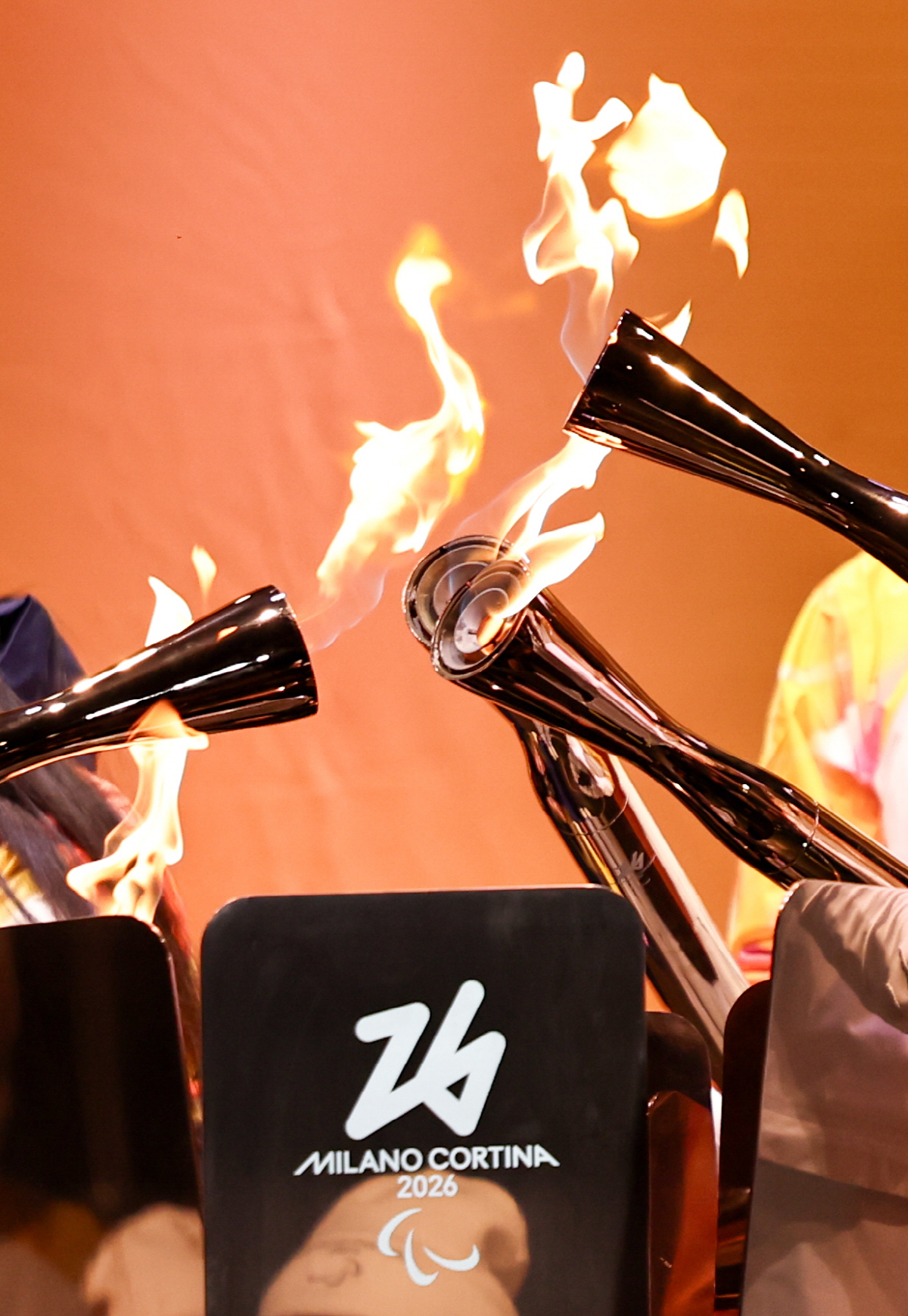 Torchbearers unify the flame during the Milan-Cortina 2026 Paralympic Winter Games Torch Relay and Flame Unifying Ceremony in Cortina D'Ampezzo, Italy, March 3, 2026.<저작권자(c) (Xinhua/연합뉴스, 무단 전재-재배포, AI 학습 및 활용 금지>