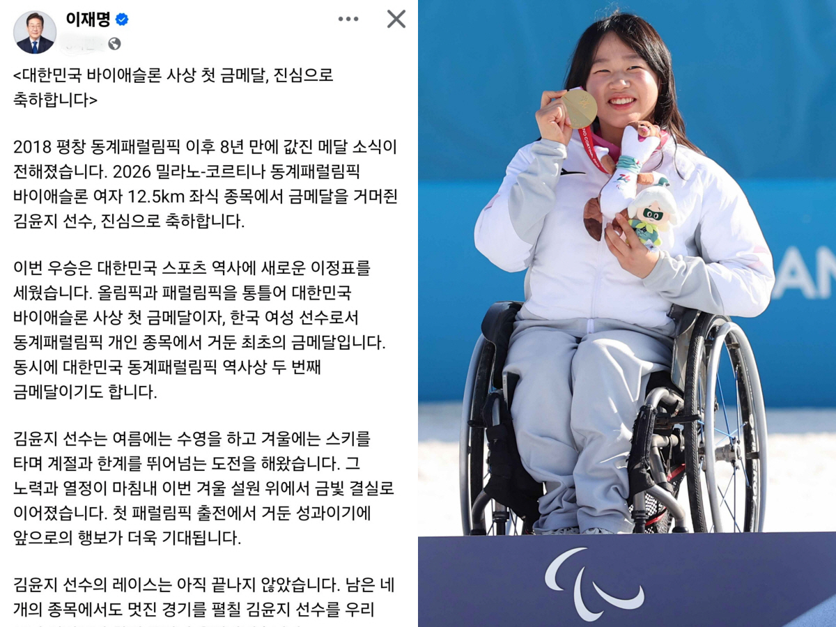 이재명 대통령이 '스마일 철녀' 김윤지(20·BDH파라스·한체대)의 동계 패럴림픽 사상 여성선수 첫 금메달. 바이애슬론 사상 첫 금메달 쾌거를 축하하며 응원의 뜻을 전했다.