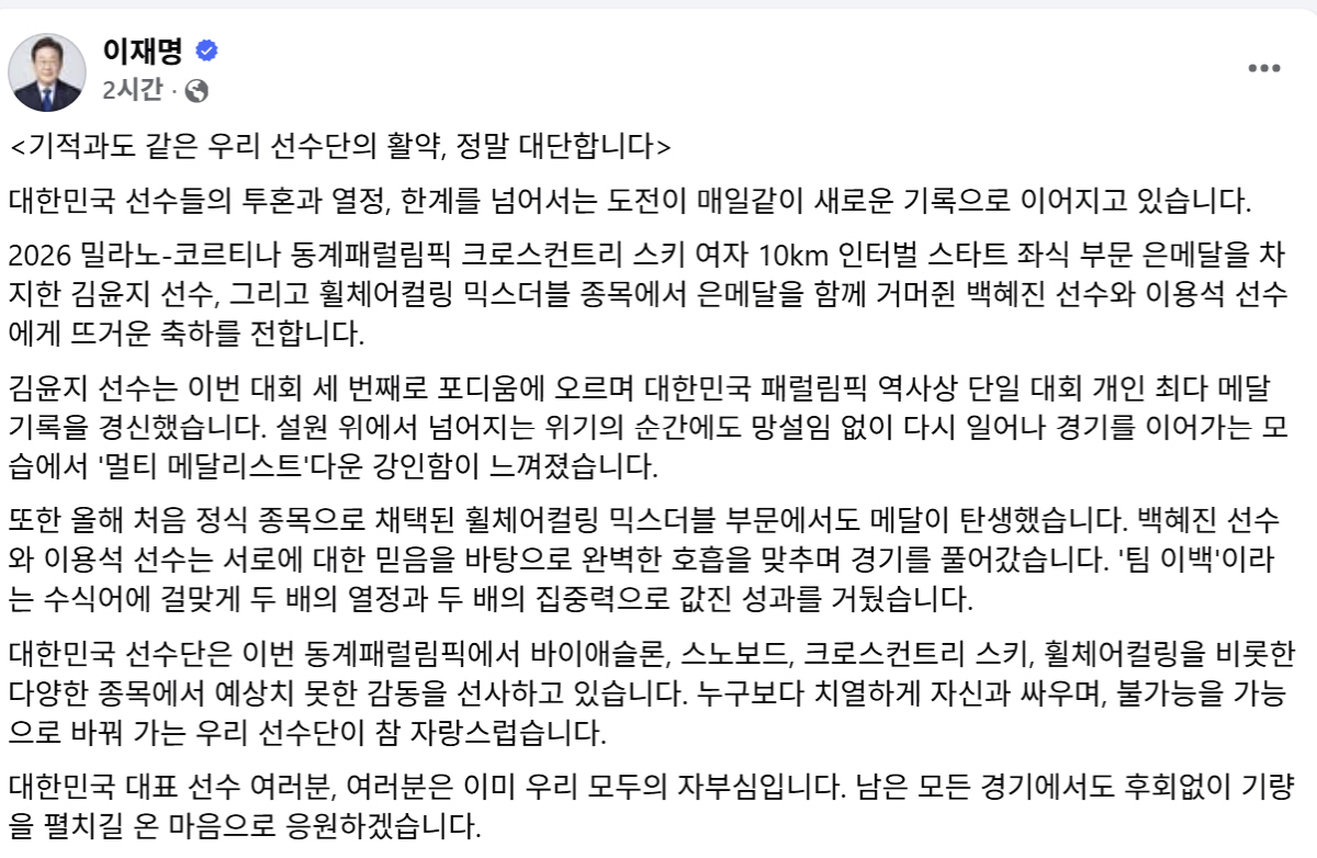 대한민국 선수들의 투혼과 열정, 한계를 넘어서는 도전이 매일같이 새로운 기록으로 이어지고 있다"며 패럴림픽 단일대회 최다 메달 획득의 역사를 쓴 '스마일 몬스터' 김윤지, 휠체어컬링 믹스더블에서 16년 만의 은메달을 따낸 백혜진-이용석조의 활약을 언급했다. "2026년 밀라노-코르티나 동계패럴림픽 크로스컨트리 스키 여자 10km 인터벌 스타트 좌식 부문 은메달을 차지한 김윤지 선수, 그리고 휠체어컬링 믹스더블 종목에서 은메달을 함께 거머쥔 백혜진 선수와 이용석 선수에게 뜨거운 축하를 전한다"면서 "김윤지 선수는 이번 대회 세 번째로 포디움에 오르며 대한민국 패럴림픽 역사상 단일 대회 개인 최다 메달(금1, 은2) 기록을 경신했다. 설원 위에서 넘어지는 위기의 순간에도 망설임 없이 다시 일어나 경기를 이어가는 모습에서 '멀티 메달리스트'다운 강인함이 느껴졌다"고 적었다. "올해 처음 정식 종목으로 채택된 휠체어컬링 믹스더블 부문에서도 메달이 탄생했다. 백혜진 선수와 이용석 선수는 서로에 대한 믿음을 바탕으로 완벽한 호흡을 맞추며 경기를 풀어갔다. '팀 이백'이라는 수식어에 걸맞게 두 배의 열정과 두 배의 집중력으로 값진 성과를 거뒀다"고 칭찬했다.