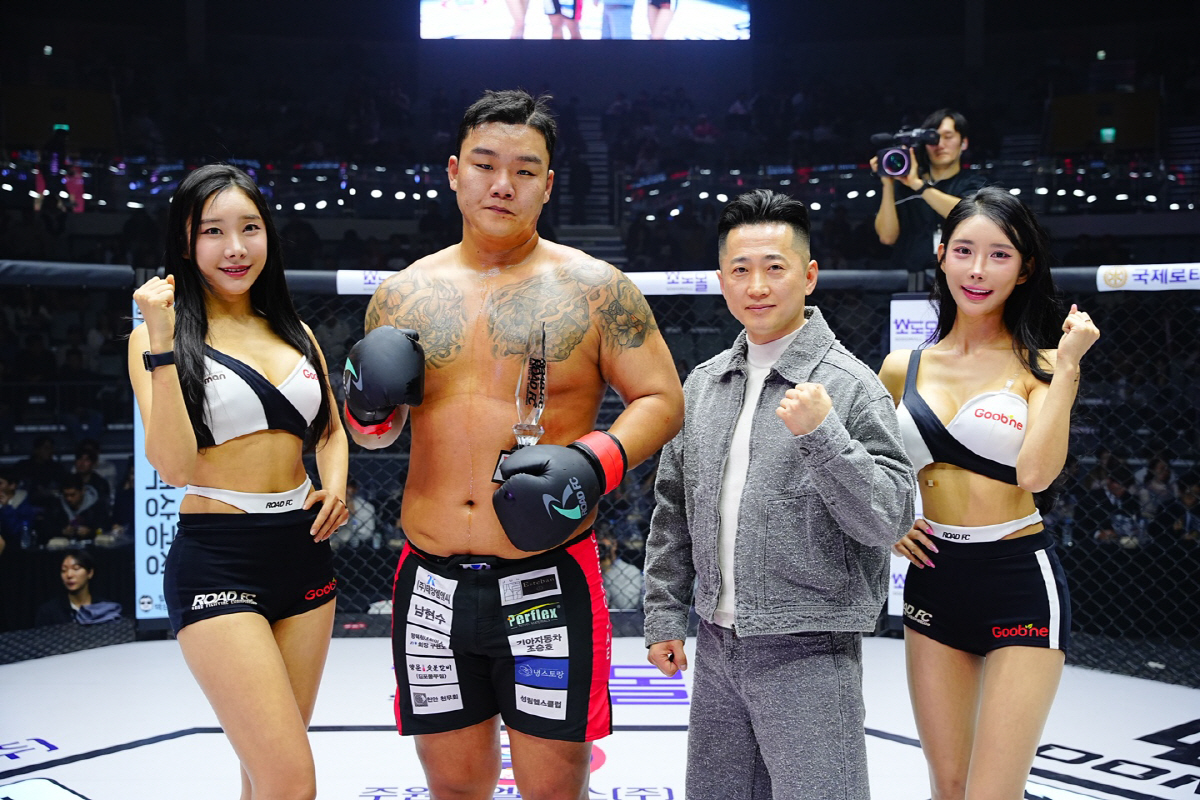원주시MMA총협회 김태위 회장이 15일 서울 장충체육관에서 열린 굽네 ROAD FC 076 헤비급 킥복싱 매치에서 승리한 이호재에게 트로피를 시상한 뒤 기념촬영을 하고 있다. 사진제공=로드FC