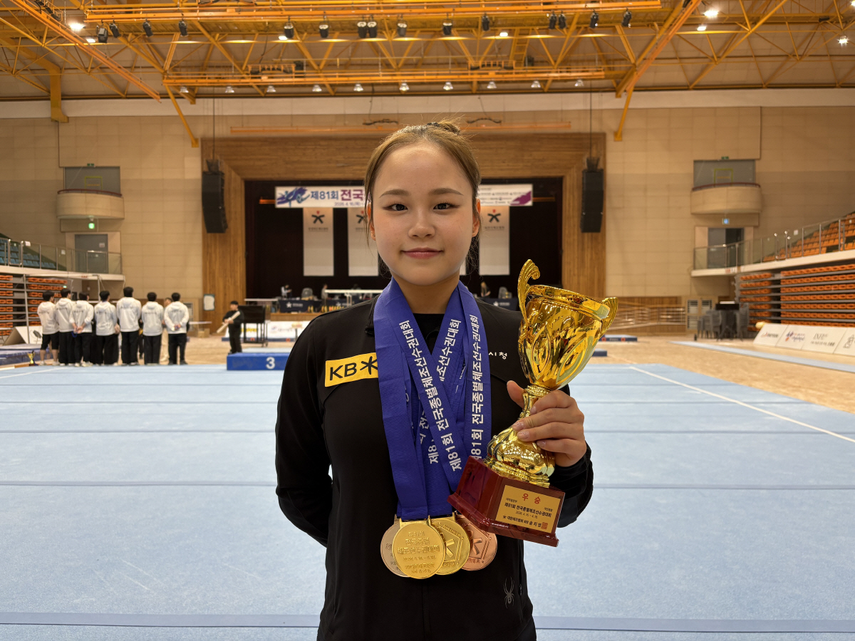 여서정은 18일 충북 제천체육관에서 열린 제81회 전국종별체조선수권에서 주종목인 도마와 평균대에서 금메달 2개를 목에 걸었다.