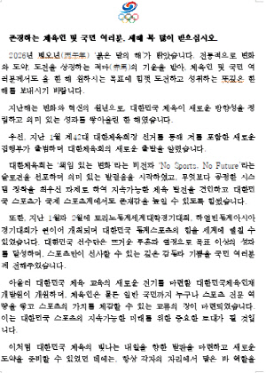 다시 한 번, 2026년 병오년에도 체육인 및 국민 여러분의 가정과 직장에 행복이 가득하기를 기원합니다.