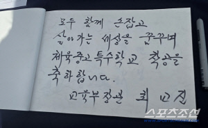최 부총리는 지난달 12일 교육부 장관으로 취임한 지 19일 만에 특수교육 현장 첫 행보로 이날 체육중고특수학교 착공식을 찾아 장애학생 체육에 대한 각별한 애정을 표했다. 방명록에 '모두 함께 손잡고 살아가는 세상을 꿈꾸며, 체육중고특수학교 착공을 축하합니다. 교육부 장관 최교진'이라고 썼다. 한국교원대 내 특수학교 예정 부지에서 열린 이날 착공식에는 최 부총리, 정 회장을 비롯, 강경숙·이연희 의원 등 내외 귀빈 100여명이 참석했다. 최 부총리는 교육계, 장애인체육계, 지역 관계자들과 세계 최초 '체육중고등특수학교'의 첫 삽을 함께 뜨며 축하와 공감의 메시지를 전했다.