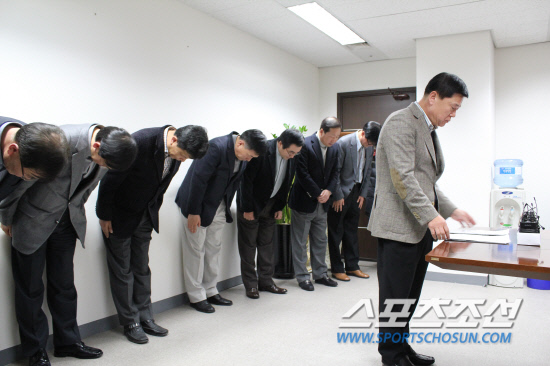 11일 서울 마포구 상암동에 위치한 한국배구연맹 대회의실에서 남녀 9개 구단 단장들과 박상설 연맹 사무총장(오른쪽)이 최근 불거진 승부조작 파문에 대해 고개숙여 사과하고 있다. 김진회 기자