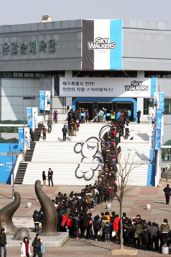 | 12일 올시즌 최다관중을 기록한 현대캐피탈-삼성화재전이 벌어진 천안 유관순체육관 입구에 팬들이 줄지어 서 있다. 사진제공=현대캐피탈 |