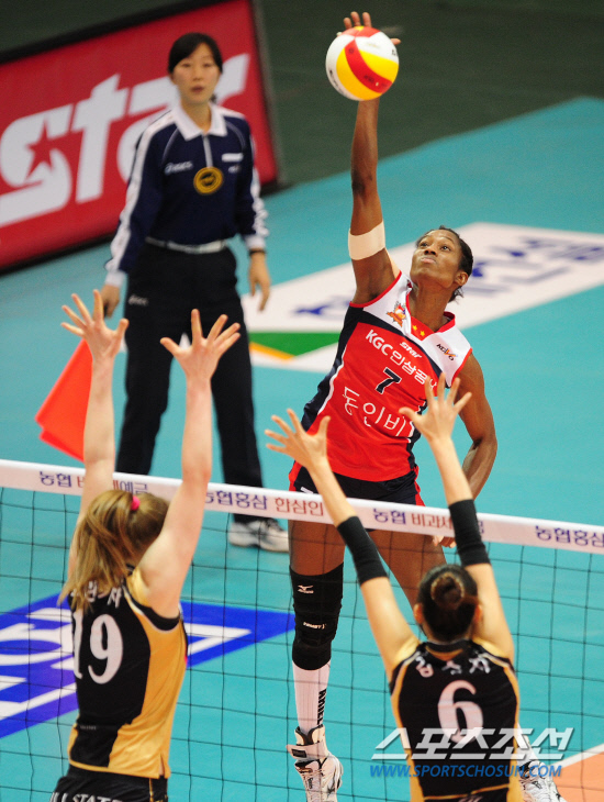 | KGC인삼공사 용병 몬타뇨가 7일 수원실내체육관에서 벌어진 2011~2012시즌 NH농협 V-리그 여자부 현대건설전에서 상대 브란키차와 양효진의 블로킹 위에서 강스파이크를 날리고 있다. 정재근 기자 cjg@sportschosun.com |