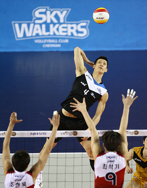문성민(가운데)이 25일 천안 유관순체육관에서 벌어진 2011~2012시즌 NH농협 V-리그 남자부 준플레이오프 1차전에서 KEPCO 블로킹 위에서 강력한 스파이크를 날리고 있다. 사진제공=현대캐피탈