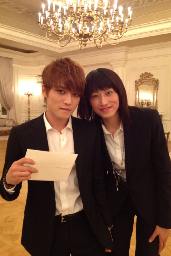 남성 3인조 그룹 JYJ의 멤버 김재중(왼쪽)과 함께 사진촬영에 임한 김연경. 사진제공=김연경
