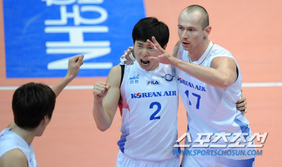 4일 인천도원실내체육관에서 열린 배구 V리그 플레이오프 3차전 대한항공과 현대캐피탈의 경기에서 대한항공 한선수가 득점에 성공한 마틴(오른쪽)과 환호하고 있다. 인천=송정헌 기자 songs@sportschosun.com
