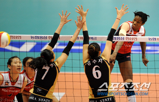 현대건설과 인삼공사의 2011-2012 프로배구 여자부 챔피언결정전 4차전이 5일 수원실내체육관에서 열렸다. 인삼공사 몬타뇨가 현대건설 윤혜숙, 김수지의 블로킹 사이로 스파이크를 시도하고 있다. 수원=허상욱 기자 wook@sportschosun.com/2012.04.05/ |