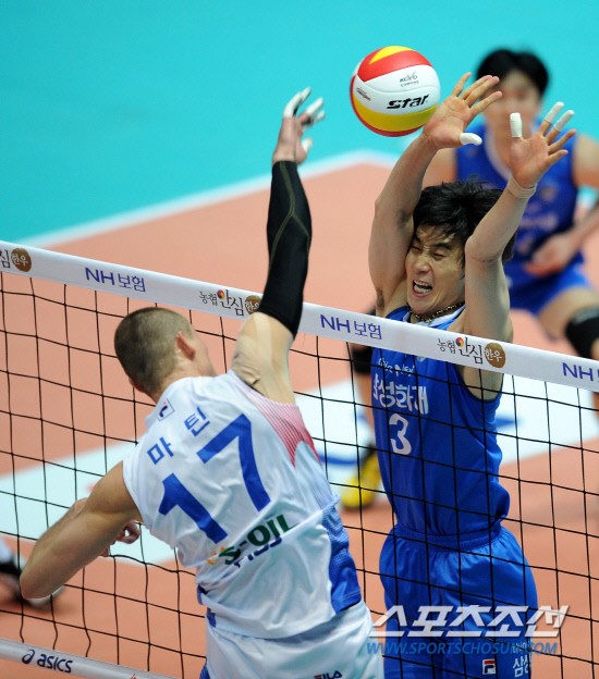 | 11일 삼성화재 박철우(오른쪽)가 대한항공 외국인선수 마틴의 스파이크를 혼신을 다해 막아내려고 시도하고 있다. 인천=허상욱 기자 wook@sportschosun.com |