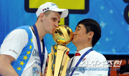 삼성화재와 대한항공의 2011-12시즌 NH농협 V리그 남자부 챔피언결정 4차전이 12일 인천 도원체육관에서 펼쳐졌다. 우승을 차지한 삼성화재 신치용 감독과 가빈이 트로피에 입을 맞추고 있다. 인천=전준엽 기자 noodle@sportschosun.com