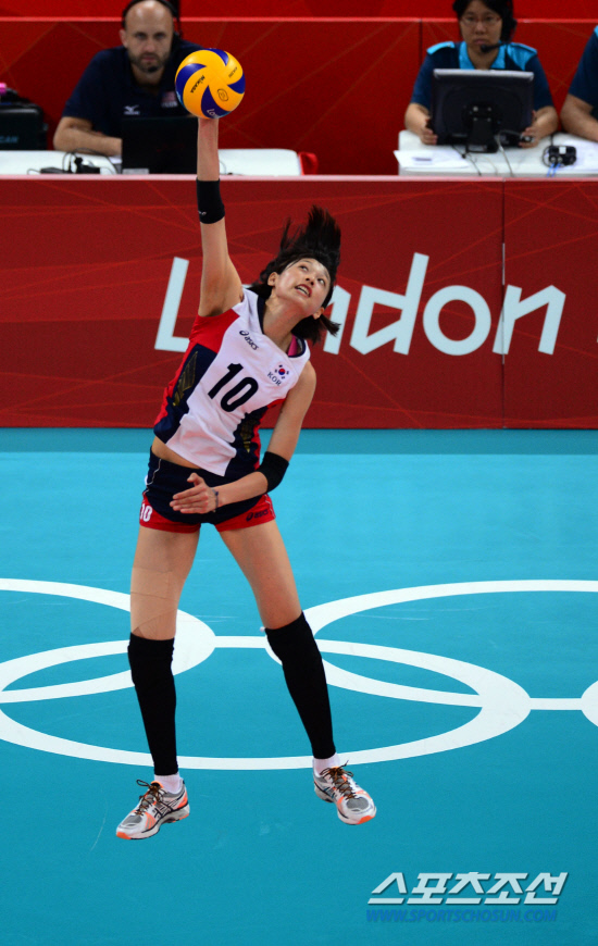 36년만에 올림픽 4강에 진출한 대한민국 여자배구 선수들이 9일(현지시간) 런던 얼스코트에서 열린 세계최강 미국과의 준결승에서 김연경이 강서브를 넣고 있다. 120809.런던=올림픽사진공동취재단E