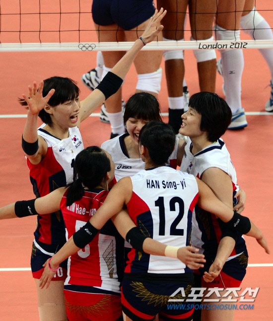 36년만에 올림픽 4강에 진출한 대한민국 여자배구 선수들이 9일(현지시간) 런던 얼스코트에서 열린 세계최강 미국과의 준결승에서 공격에 성공한 후 기뻐하고 있다. 120809.런던=올림픽사진공동취재단E