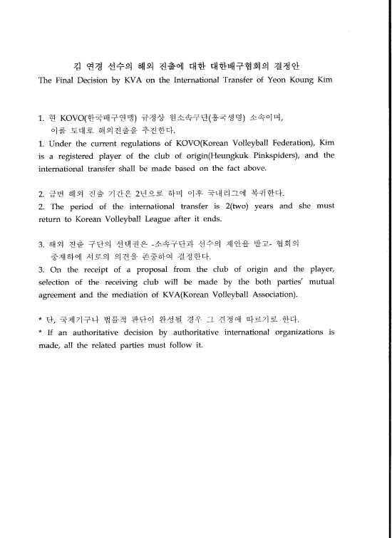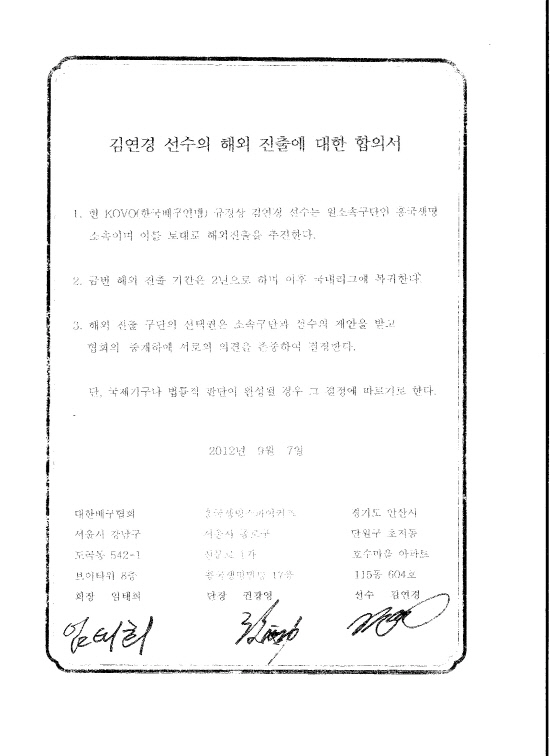 흥국생명은 지난 27일 터키 페네르바체에 대한배구협회(임태희 회장), 권광영 흥국생명 단장, 김연경이 합의한 문서를 보냈다. 이 합의서는 지난달 7일 작성됐다. 이 문서는 김연경의 원소속구단이 흥국생명이라는 점을 명시하고 있다. 또 이번 해외 진출 기간은 2년, 이후 국내리그에 복귀한다는 조항도 담겨있다. 다음으로 협회의 중재에 따라 구단과 선수가 서로 의견을 존중해 이적 구단을 정한다는 것이 골자다. 단, 국제기구나 법률적 판단이 완성될 경우 그 결정을 따르기로 했다.