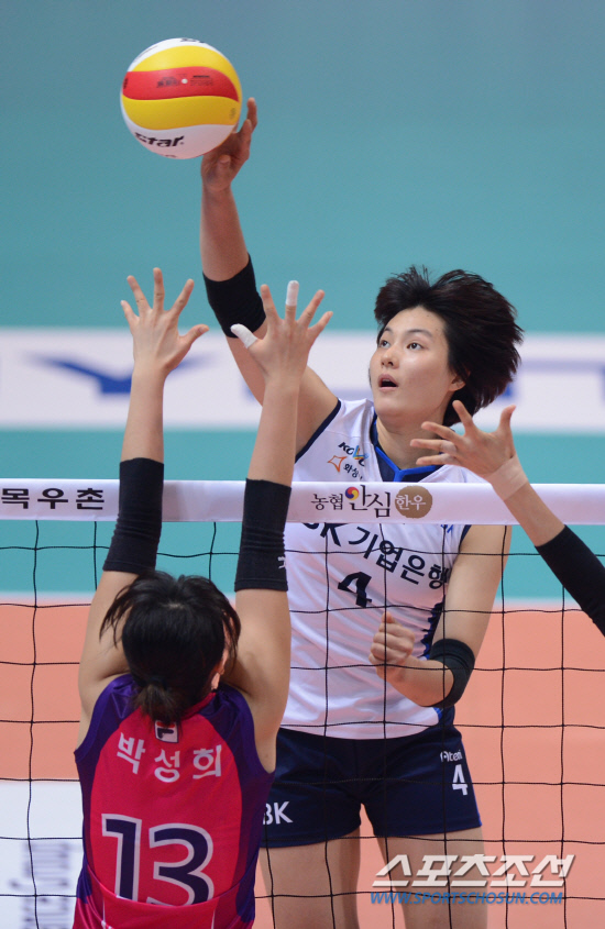 4일 오후 인천 도원실내체육관에서 2012-1213 V리그 기업은행과 흥국생명의 경기가 열렸다. 기업은행 김희진(오른쪽)이 흥국생명 박성희의 블로킹을 넘어 스파이크 공격을 시도하고 있다. 인천= 김경민 기자 kyungmin@sportschosun.com