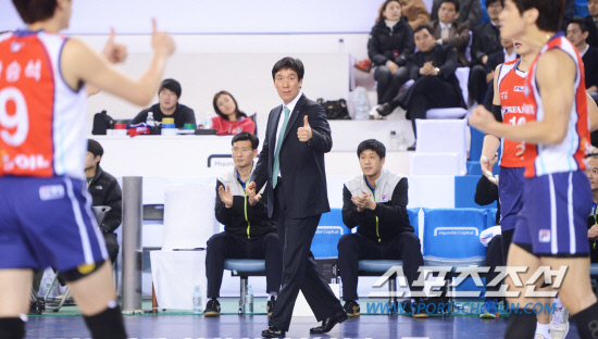 2012-2013 프로배구 V리그 남자부 대한항공과 현대캐피탈의 경기가 20일 천안 유관순경기장에서 열렸다. 대한항공이 세트스코어 3대1로 현대캐피탈을 대파한 가운데 신영철 감독이 선수들에게 엄지손가락을 들어 보이고 있다. 천안=최문영 기자 deer@sportschosun.com