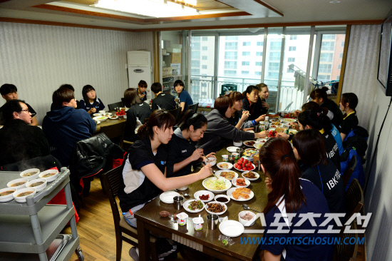 기업은행 선수들의 숙소는 경기도 수원시 장안구 조원동에 위치한 고층 아파트였다. 이제 갓 두 돌을 넘긴 '막내 구단' 기업은행은 선수단 전용숙소와 체육관이 마련돼 있지 않았다. 어쩔 수 없이 불편을 감수하고 택한 것이 아파트였다. 코칭스태프를 비롯해 선수, 통역, 트레이너 등 20명 정도의 선수단이 뿔뿔이 흩어져 다섯 집 살림을 하고 있다. 198㎡(60평) 한 채, 165㎡(50평) 세 채, 79㎡(24평) 한 채로 구성돼 있다. 방의 크기대로 3인 1실, 2인 1실, 1일 1실로 배정됐다. 이 중 한 채는 선수 숙소 겸 식당으로 이용되고 있다. 여느 외국인선수들이 그러하듯 기업은행의 알레시아도 특별대우를 받고 있다. 79㎡ 한 채에 혼자 살고 있었다. 이정철 기업은행 감독의 집은 '사랑방'이다. 거실에는 물리치료 기계와 매트가 놓여 있었다. 장소가 협소하다보니 감독의 집에 물리치료실을 꾸릴 수밖에 없었다. 이 감독은 "선수들이 불편하지만, 가까워지는 기회도 된다"고 했다. 선수들이 경기에 패한 직후 물리치료를 위해 감독의 집을 찾는 것을 싫어할 법도 하지만 전혀 그렇지 않다. 감독과 선수들이 눈을 마주치면 가족처럼 금새 화가 풀리곤 한단다. 아파트의 매력이다.