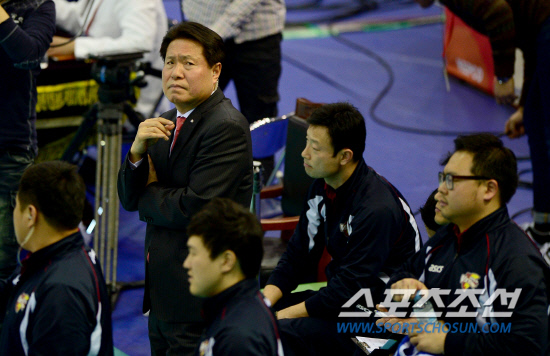 22일 수원실내체육관에서 배구V리그 KEPCO와 LIG손해보험의 경기가 열렸다. 연패에 빠져 있는 KEPCO 신춘삼 감독이 걱정스러운 표정으로 스코어가 나와 있는 전광판을 바라보고 있다. 수원=송정헌 기자 songs@sportschosun.com
