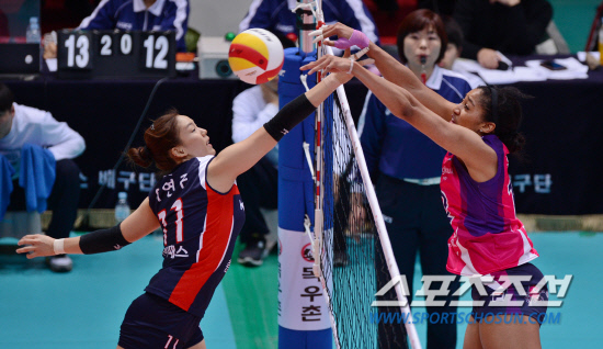 20일 오후 인천 도원실내체육관에서 2012-2013 여자프로배구 인삼공사와 흥국생명의 경기가 열렸다. 흥국생명 휘트니(오른쪽)가 인삼공사 이연주와 볼을 다투고 있다. 인천=김경민 기자 kyungmin@sportschosun.com / 2013.02.20.