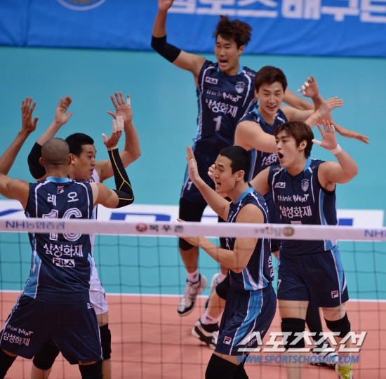 20일 오후 인천 도원실내체육관에서 2012-2013 프로배구 삼성화재와 대한항공의 경기가 열렸다. 1세트 공격을 성공시킨 삼성화재 선수들이 환호하고 있다. 인천=김경민 기자 kyungmin@sportschosun.com