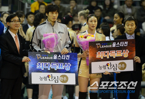 13일 서울 잠실학생체육관에서 배구 V리그 올스타전이 열렸다. K스타팀-V스타팀으로 펼쳐진 올스타전에서 여자부 선수들이 1, 3세트를 남자부 선수들이 2, 4세트에서 대결한다. 최다득표를 차지한 남자부 김학민과 여자부 김혜진이 포즈를 취하고 있다. 잠실=송정헌 기자 songs@sportschosun.com/2013.1.13