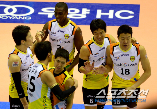 17일 아산 이순신실내체육관에서 배구 V리그 남자부 러시앤캐시와 대한항공의 경기가 열렸다. 3세트를 역전으로 따낸 러시앤캐시 선수들이 기뻐하고 있다. 아산=송정헌 기자 songs@sportschosun.com