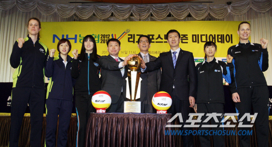 14일 열린 프로배구 여자부 포스트시즌 미디어데이 행사에서 3개 팀 감독과 선수들이 우승컵을 사이에 두고 결전을 다짐하고 있다. 사진제공=KOVO