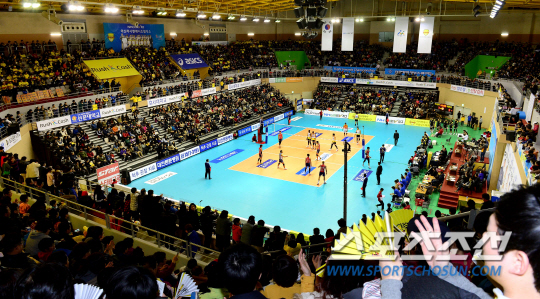 17일 아산 이순신실내체육관에서 배구 V리그 남자부 러시앤캐시와 대한항공의 경기가 열렸다. 정규리그 5위를 기록하고 있는 러시앤캐시는 아산 홈경기를 만원관중으로 펼치고 있다. 3500여석을 가득 메운 관중들이 배구 열기를 만끽하고 있다. 아산=송정헌 기자 songs@sportschosun.com