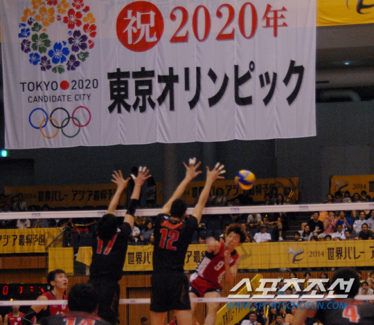 곽승석이 스파이크를 날리고 있다. 뒤에는 2020년 도쿄올림픽 유치 성공을 축하하는 플래카드가 걸려있다. 고마키(일본)=이 건 기자 bbadagun@sportschosun.com