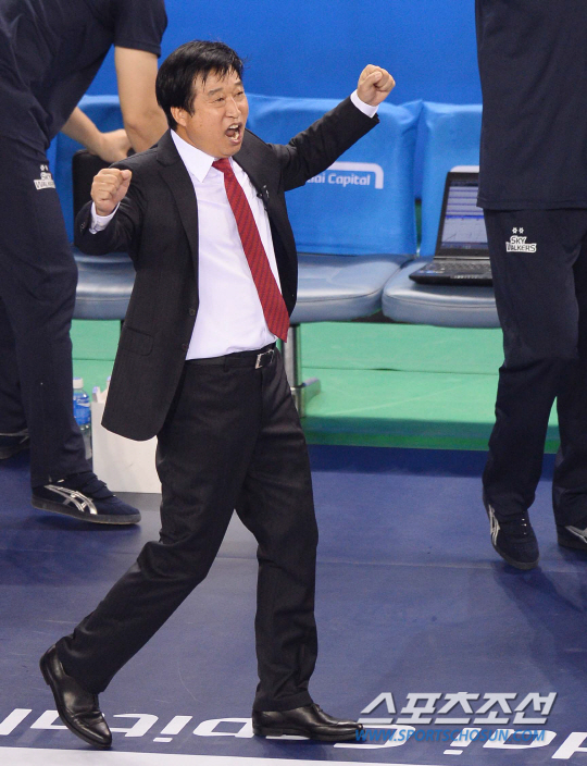 2013-2014 프로배구 V리그 현대캐피탈과 우리카드의 경기가 3일 천안유관순체육관에서 열렸다. 현대캐피탈 김호철 감독이 2세트 26점까지 가는 접전끝에 팀이 승리하자 환호하고 있다. 천안=최문영 기자 deer@sportschosun.com /2013.11.03/ |