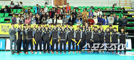 | 신생팀 러시앤캐시가 5일 대한항공을 상대로 첫 경기를 치른다. 사진은 3일 팬들과 함께 즐거운 시간을 보내고 있는 선수단 모습. 사진제공=러시앤캐시 |