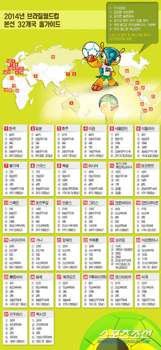 2014년 브라질월드컵을 뜨겁게 달굴 32개국의 진용이 확정됐다.