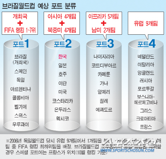 브라질월드컵은 또 다르다. 전통의 강호들이 톱시드에서 탈락하면서 곳곳이 지뢰밭이다. '죽음의 조'에 위치할 가능성이 어느 대회보다 높다. 1그룹의 브라질, 스페인, 독일, 아르헨티나에다 4그룹의 네덜란드, 이탈리아, 잉글랜드, 포르투갈 등과 한 조에 속하면 가시밭길이다.